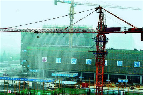 原理:喷淋系统含附着于塔身的垂直管道、附着于起重臂的水平管道、控制箱、管件、喷头等,自来水补充水源,通过立管及平管高压供水,喷头向下喷洒雾状水,降尘效果较理想、成本较低廉高空塔吊喷淋机设备提供一种基于塔吊、用于降低空气中可吸入颗粒物的高空降尘喷淋系统。