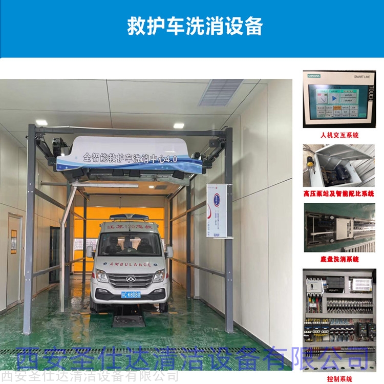 西安圣仕达清洁设备的西安救护车洗消站设备 无人接触自动化清洗 清洗消毒一体化设计,救护车洗消通道由全自动底盘洗消系统与全自动车体洗消系统组合而成,通过一套PLC控制系统对整套设备进行自动化控制,具备消毒液的自动配比和洗消废水处理循环利用功能,可高效、快捷地对车辆进行连续清洗、消毒等一整套作业。