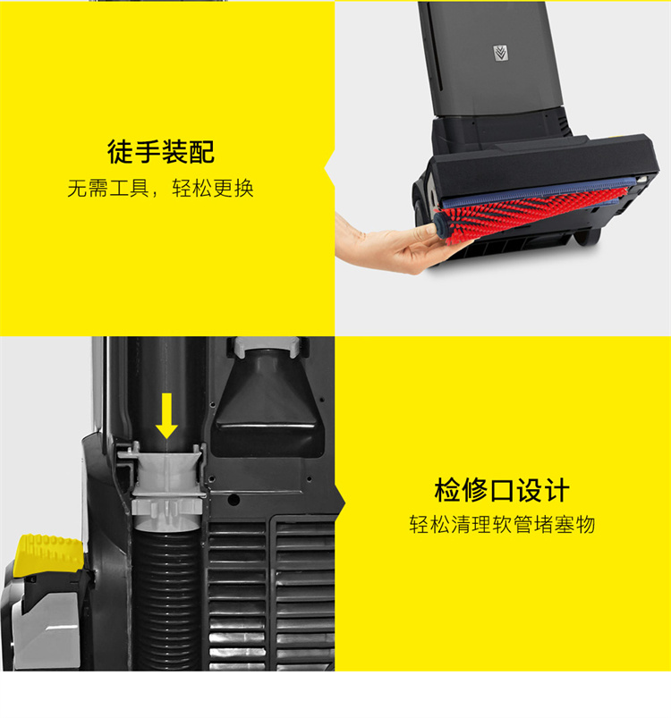 机器采用直立式设计,和直立式吸尘器一样便于操纵。与拖把相比,与地板的接触压力更高,清洗力量更强。刷子的转速为每分钟1500转。机器可以向前和向后抽吸。对于粘性很强的污渍,可以通过踏板抬高刷吸耙高度来加强持续的对地面接触力。