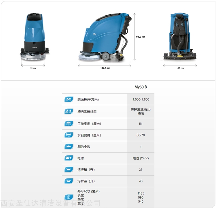 飞默普洗地机,意大利FIMAP电动拖地机,My50洗地吸干机尤其适用于清洁面积为1,000至1,600平方米的地面。在进行维护性清洁操作以及清洁存在顽固污垢的环境时,推荐使用本款洗地机。它的设计能够满足客户对高工作效率、低管理成本和使用便捷性等的要求。My50 是一款手推式洗地机,配有半自动牵引驱动,可以选择电源线或电池供电My50 对于寻求操作性强、能够大幅度节省管理成本机型的客户而言,它是一种理想选择